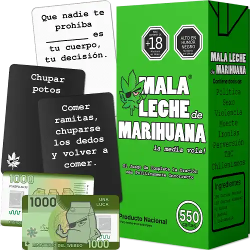 Con más de 10.000 unidades vendidas, Mala Leche es el juego que se ríe de lo incorrecto, de lo que nadie se atreve a decir en voz alta, pero todos pensamos. Con cada carta, las combinaciones se vuelven más desubicadas y las risas más fuertes. Es humor negro chileno en su estado más puro: cruel, estupido y desubicado.