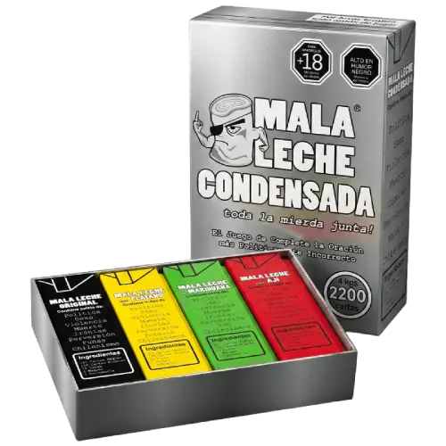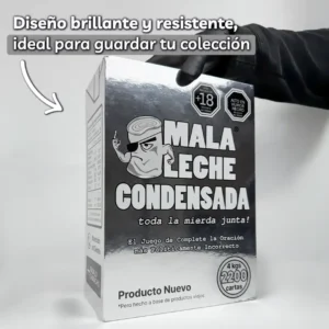 Esta pieza de colección especial te deja organizar toda tu obscenidad en un solo lugar. Mala Leche Condensada viene con tablero, ficha y espacio para tus 4 cajas. Es como un templo para tu humor más tóxico.