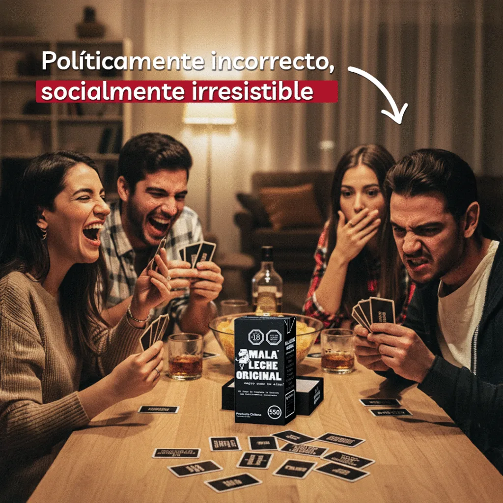 Mala Leche Original es el juego con el que comenzo todo. El que se ríe de lo incorrecto, de lo que nadie se atreve a decir en voz alta, pero todos pensamos. Con cada carta, las conversaciones se vuelven más ácidas y las risas más fuertes. Es humor negro chileno en su estado más puro: rápido, cruel y completamente adictivo.